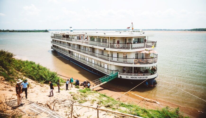 Return by riverboat to the RV boat, weigh anchor and cross the border into Cambodia and continue up the Mekong river.